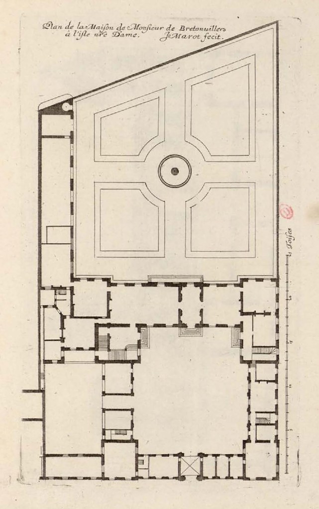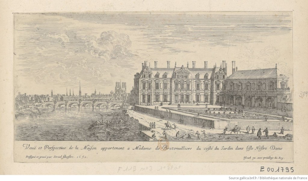 The Hôtel Bretonvilliers was once one of the most magnificent private homes in Paris. The home, a large estate, garden and six adjacent apartment buildings, was created for Claude Le Ragois de Bretonvilliers. The home, whose entrance was originally located at No4 rue Bretonvilliers, occupied the most prestigious lot on the island and encompassed all of the land on the south eastern tip facing directly upstream.