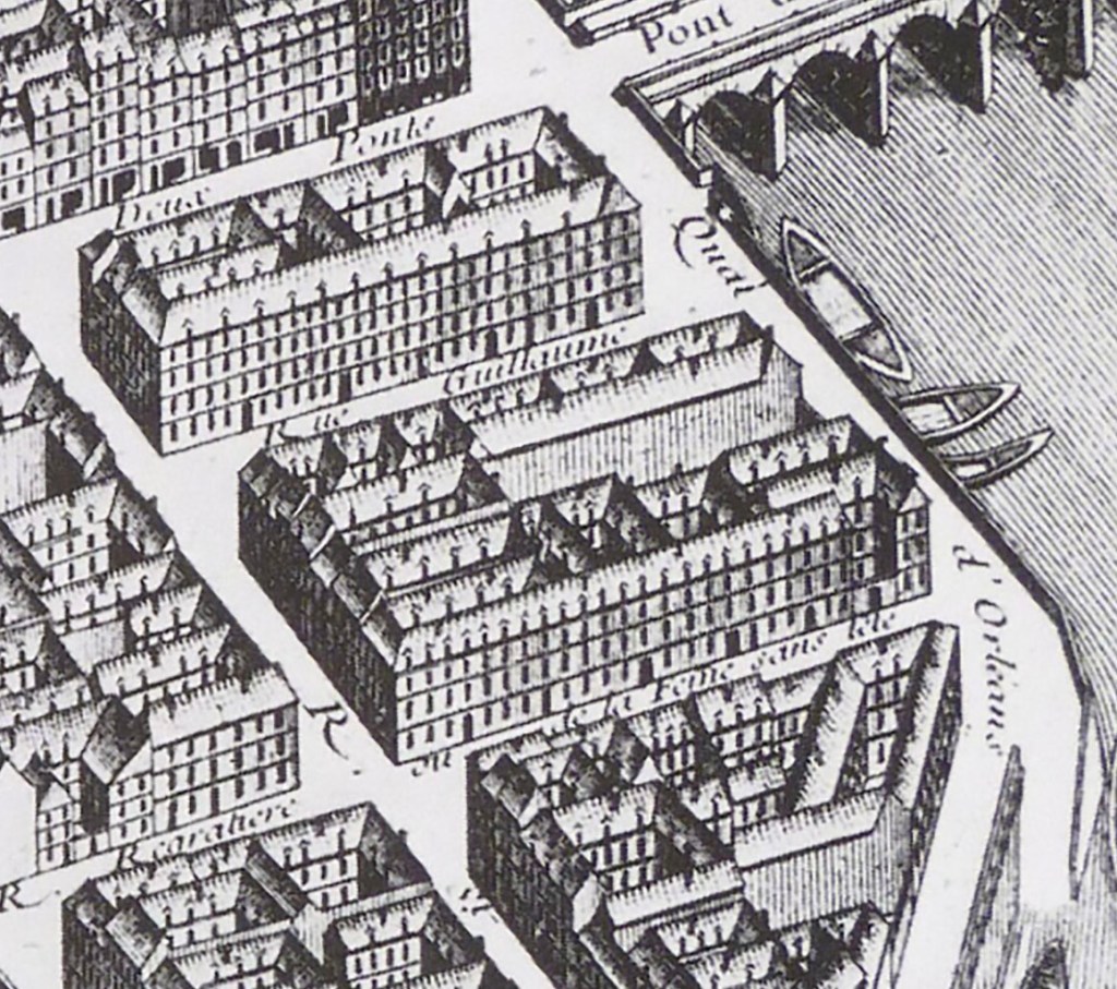 Research indicates the widow of the provost of the merchants, Michel Moreau, brought the estate into her second marriage, so it is likely that Monsieur Moreau was the first owner of the plot of land or indeed commissioned the original mansion which dates to the development of the island in 1640. The main gate of the home was located at its current site on rue Saint-Louis en l’Île (then rue Traversante) with the first courtyard beyond the gates and the public and private apartments directly in front and flanking the enclosure, with another courtyard behind the first and the garden beyond that extending all the way to the quai d’Orléans on the southern shore of the island.