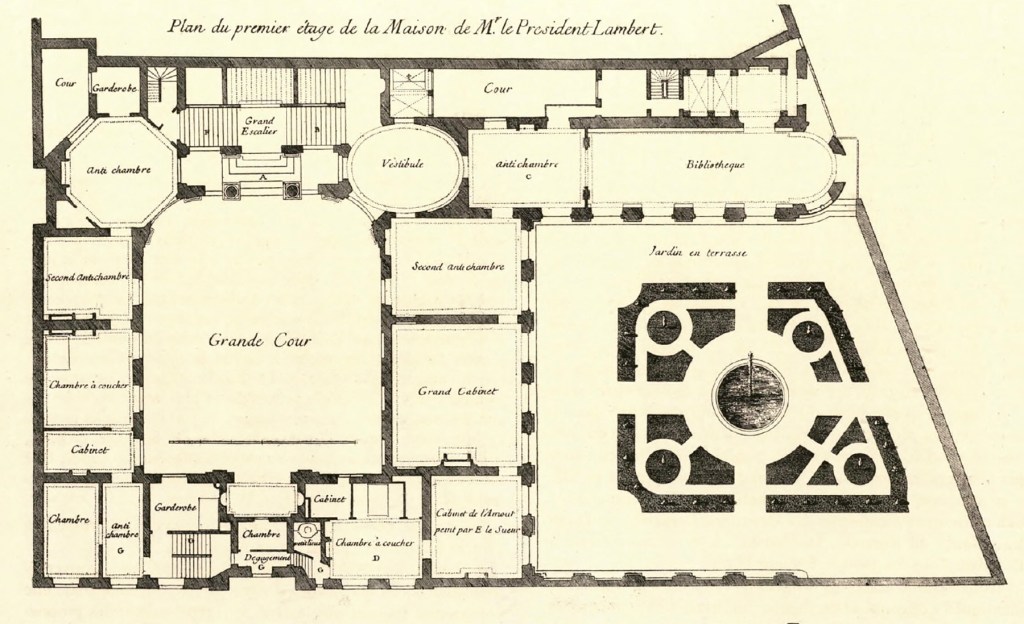 The plot of the Hôtel Lambert required Le Vau to cleverly design the house with the carriage entrance on rue Saint-Louis en l’Île entering the Grand Cour with the garden at a right angle on the side of the structure allowing for the best views and the maximum amount of light. The plot was also sloped, so the staff quarters, stables, and service area were kept on the ground floor, which was also unique, with the garden and the public areas suspended above on the first and second levels allowing for the best possible amount of light and air, and of course, the best possible views of the river.