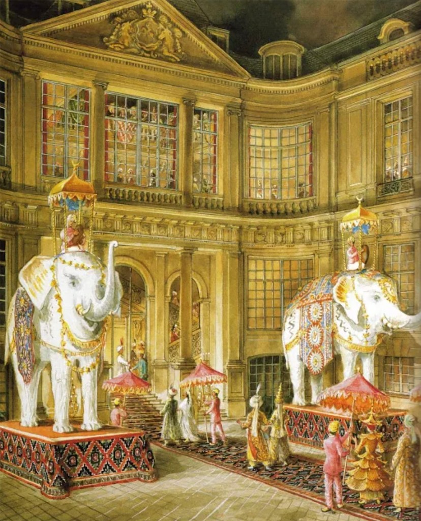 During his more than 50 year tenure in the building, Baron de Redé was responsible for restoring much of the grand maison to its former glory. He was also responsible for some of the most talked about and legendary parties of post-war Paris including the 1957 Bal des Têtes, and the 1969 Bal Oriental. For the latter, the Baron had his event staff construct two life-size paper-mâché Elephants that greeted guests while bodybuilders dressed as Nubian warriors held torches to light the way as invitees ascended the Lambert’s famous staircase. The guest list was a who’s who of high society, the arts and Hollywood of the time.