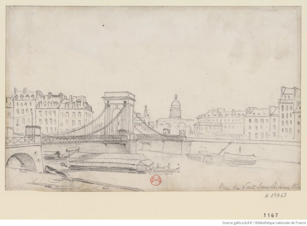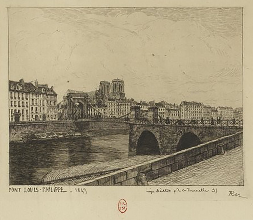 The stone for the first Pont Louis-Philippe was laid in 1833 to celebrate King Louis-Philippe’s (b. 1173 – d. 1850) accession to the throne in 1830. The Séquin brothers, the creators of France’s first railway and pioneers of a suspension bridge system, were given a financial grant to build the bridge, but they assumed any additional costs in exchange for the right to charge a toll for a period of 49 years. The bridge took a year to build and was opened to traffic on the 29th of July, 1834.