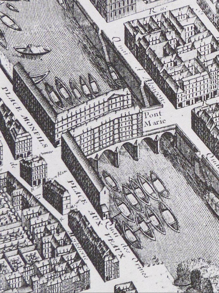 Though the bridge was completed in 1635, it was destroyed by a flood 2 years later in 1637. It was quickly rebuilt, but on the 1st of March, 1658 the bridge was inundated by a flood which swept away the 2 arches closest to the island and the 22 houses atop them. Almost 60 people perished in the disaster. A wooden span was quickly built to replace the missing stone spans, and a toll was charged for a period of ten years in order to finance rebuilding the missing portion of the bridge. The work to replace the missing arches was not completed until 1664, and houses were not rebuilt on the newly constructed spans. The surviving houses remained on the bridge until 1786 when Louis XVI (b. 1754, d. 1793) issued a royal edict ordering the removal of houses on all of Paris’ bridges.