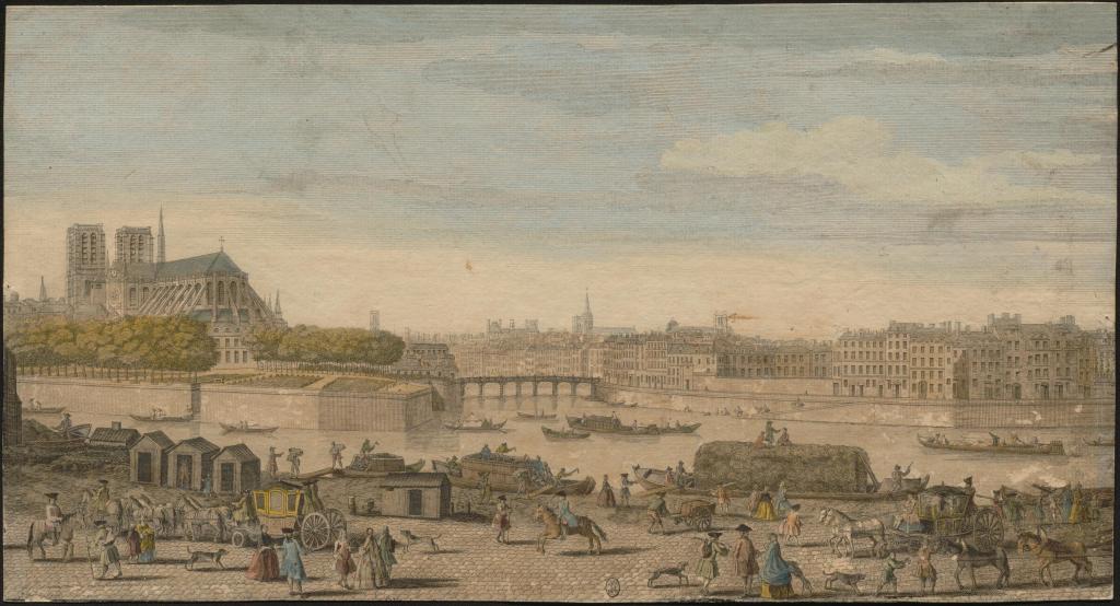 One of the most interesting things about the first series of bridges was how they got their shape. The span, which was accessible only to pedestrians and had no houses on it, had a unique curve at its western end that owed itself to the jealousy of the Chanoines of Notre Dame. They had never been happy about the development of Île Saint-Louis, and indeed one of their demands to the development of the island was that the waterway between the two would never be filled in, so when the bridge was first begun it could have easily crossed the Seine directly, but the canons objected, seeing as the bridge’s terminus would be land that at that time was a garden of the church. So the bridge curved along the edge of the eastern end of Île de la Cité and terminated near the end of rue des Chantres instead of running directly across.