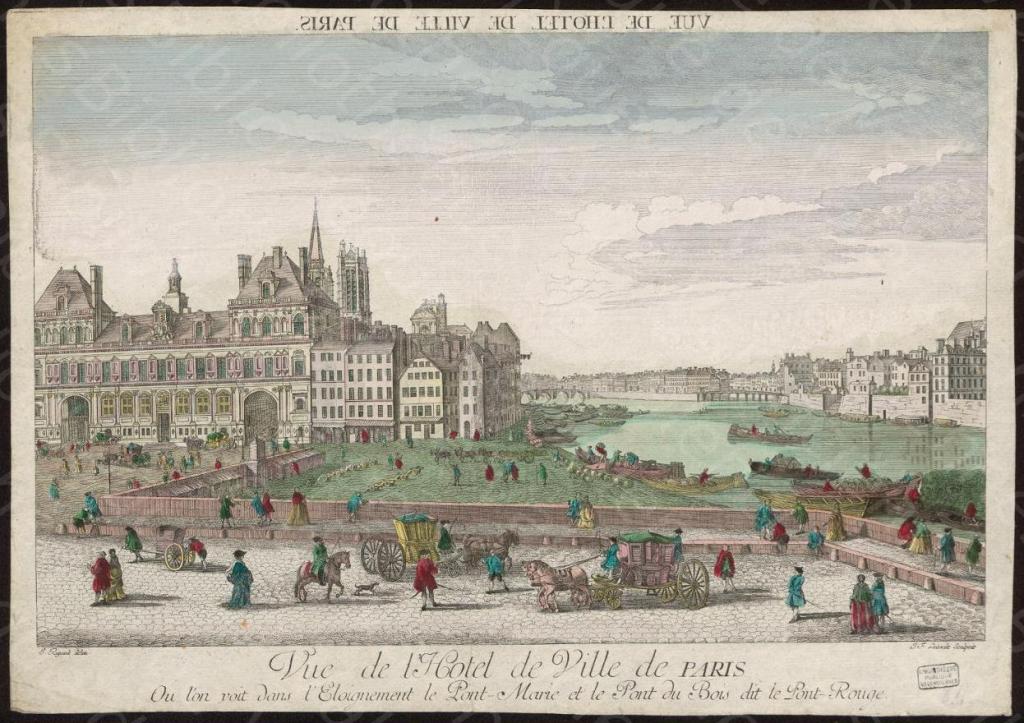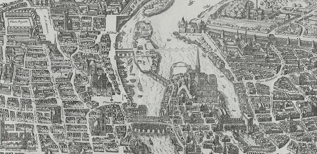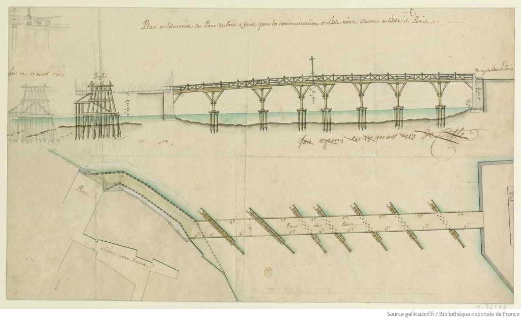 The first bridge to cross the channel in the Seine between the two islands was called the Pont de Bois. Some sources put the date of construction of that bridge at 1614, but the 1615 map of Mathieu Mérian shows no bridge, indicating that construction on the first bridge between the islands most likely began later. The 1630 map of Tavernier clearly shows a bridge linking the two islands.