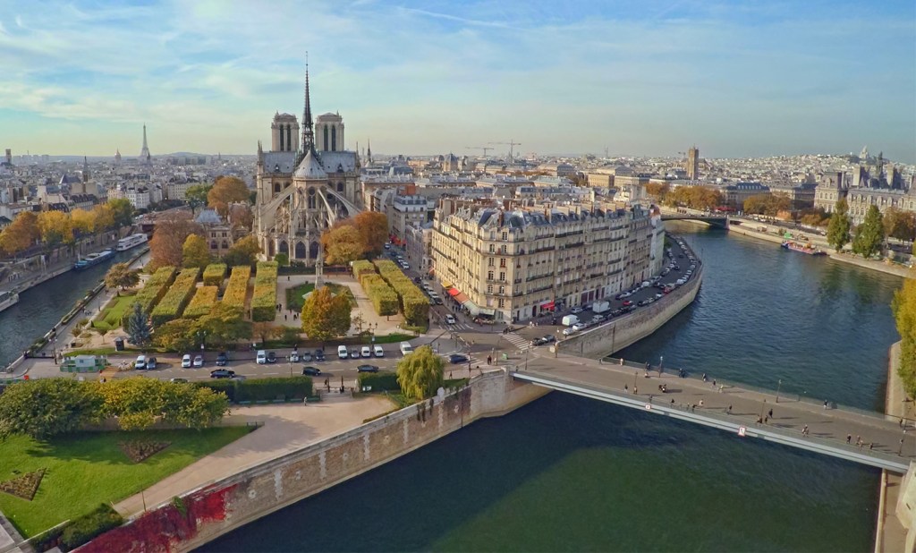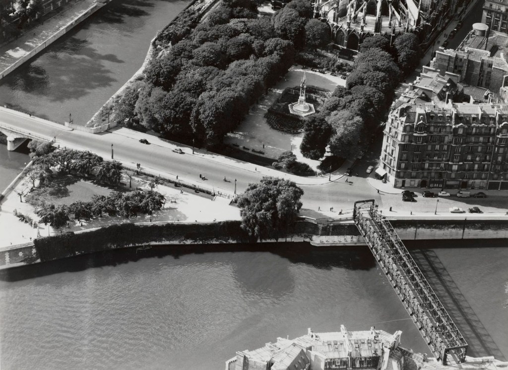 It’s worth noting here that Pont Louis-Philippe originally ran from the right bank through the western-most tip of Île Saint-Louis to Île de la Cité. (You can see part of the span of Pont Louis-Philippe in the lower left hand corner of the photo above.) So from the 1830’s to 1860 there were two bridges linking the two islands across the channel.
